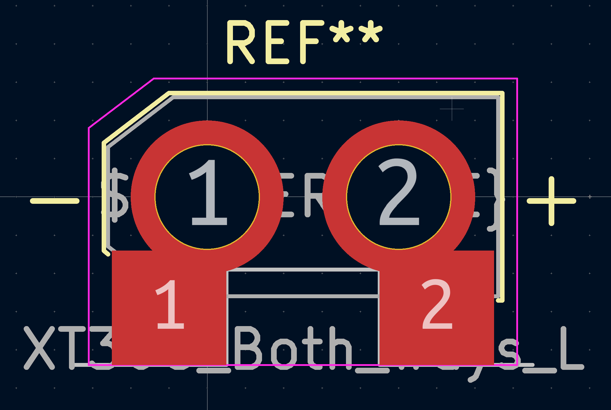 This modifies a vertical XT30 footprint to add a board-edge cutout so that it can also be soldered to the edge of the board. There are two variants with the cutout on each side.